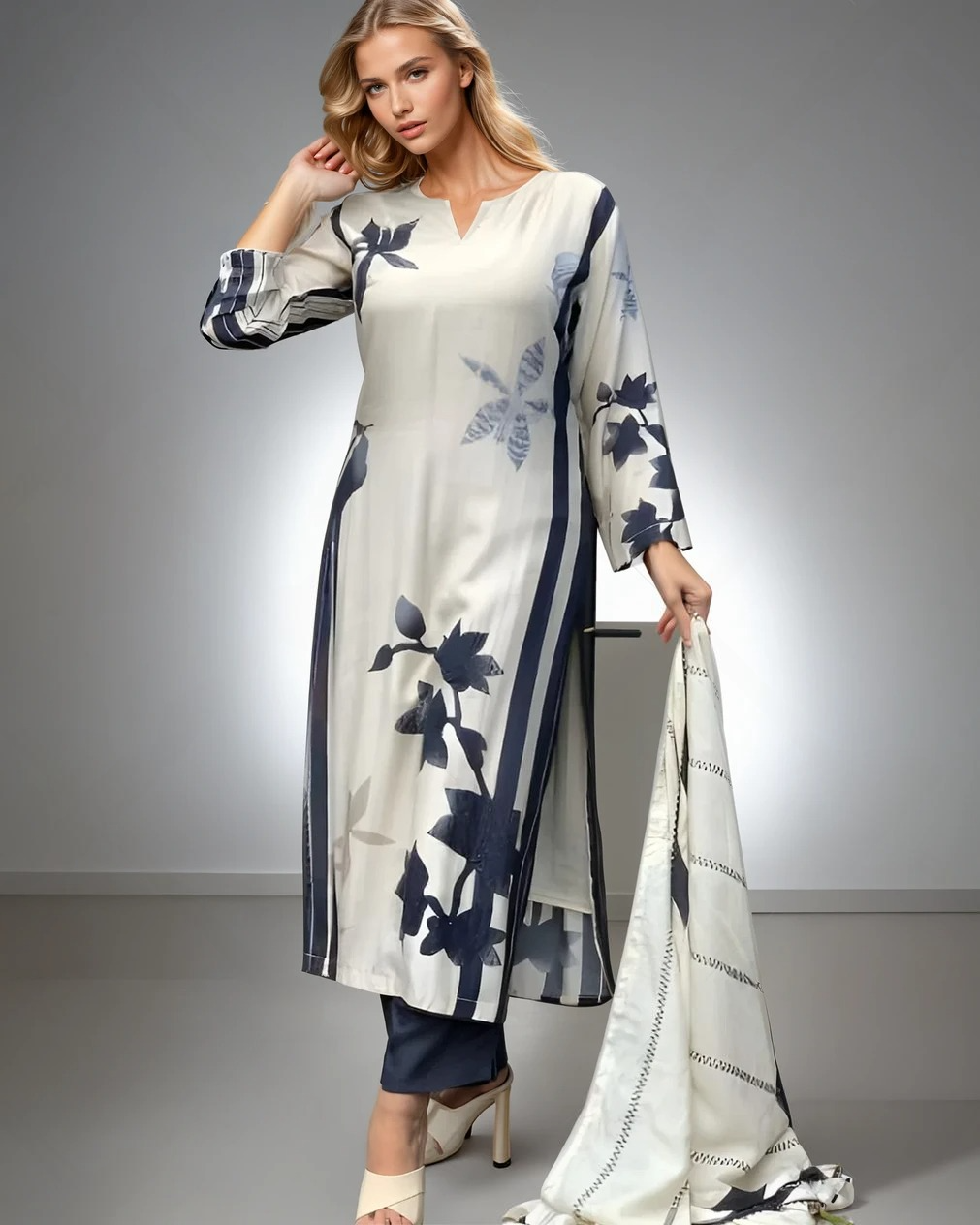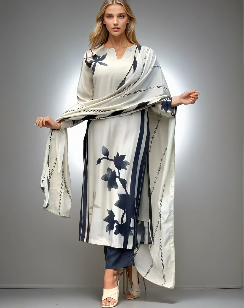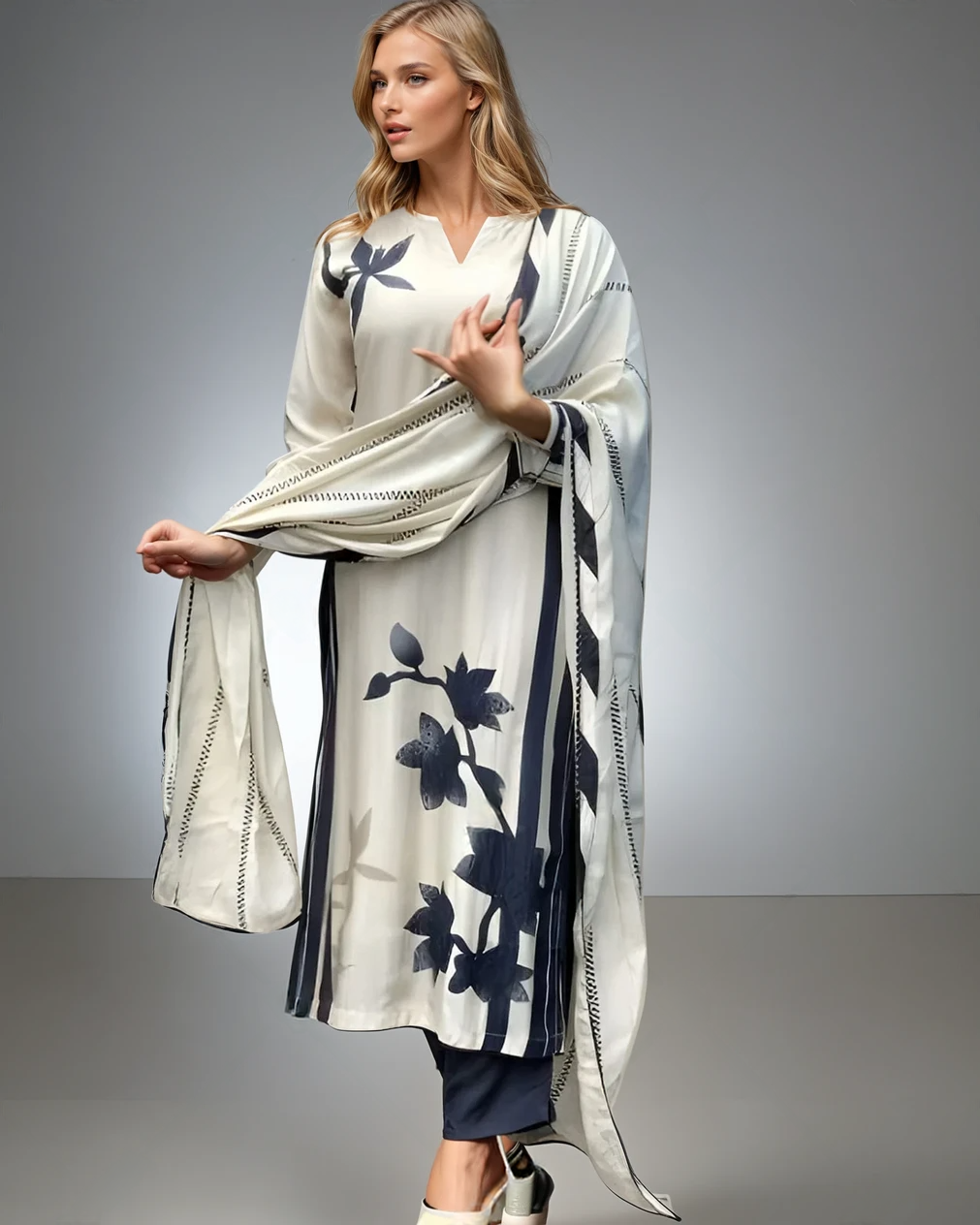 - Elevate your ethnic style with Fabcouture’s Kashmiri Floral Kurta set paired elegantly with Bottom Pant and complemented by a Printed Dupatta. This ensemble exudes sophistication and charm, making it perfect for special occasions and celebrations.